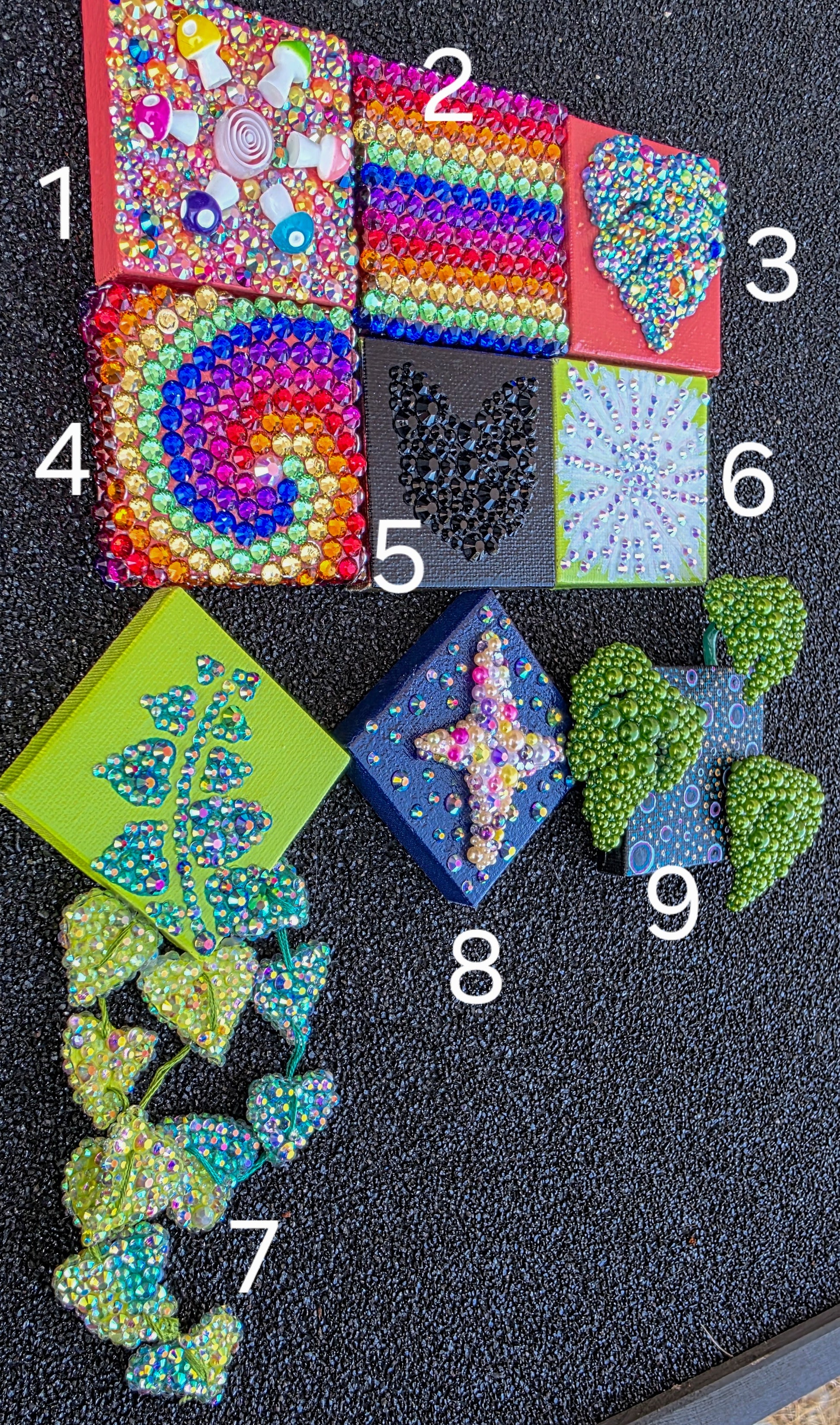 These mini canvas (2inch by 2 inch) feature their own unique design ranging from bedazzles, to sculpted leaves. If you would like, I can add an extra magnet to the back and they can be used on any metal surface or attached to a metal tack on the wall. Just add your preference in the notes of your order and I'll make it so.