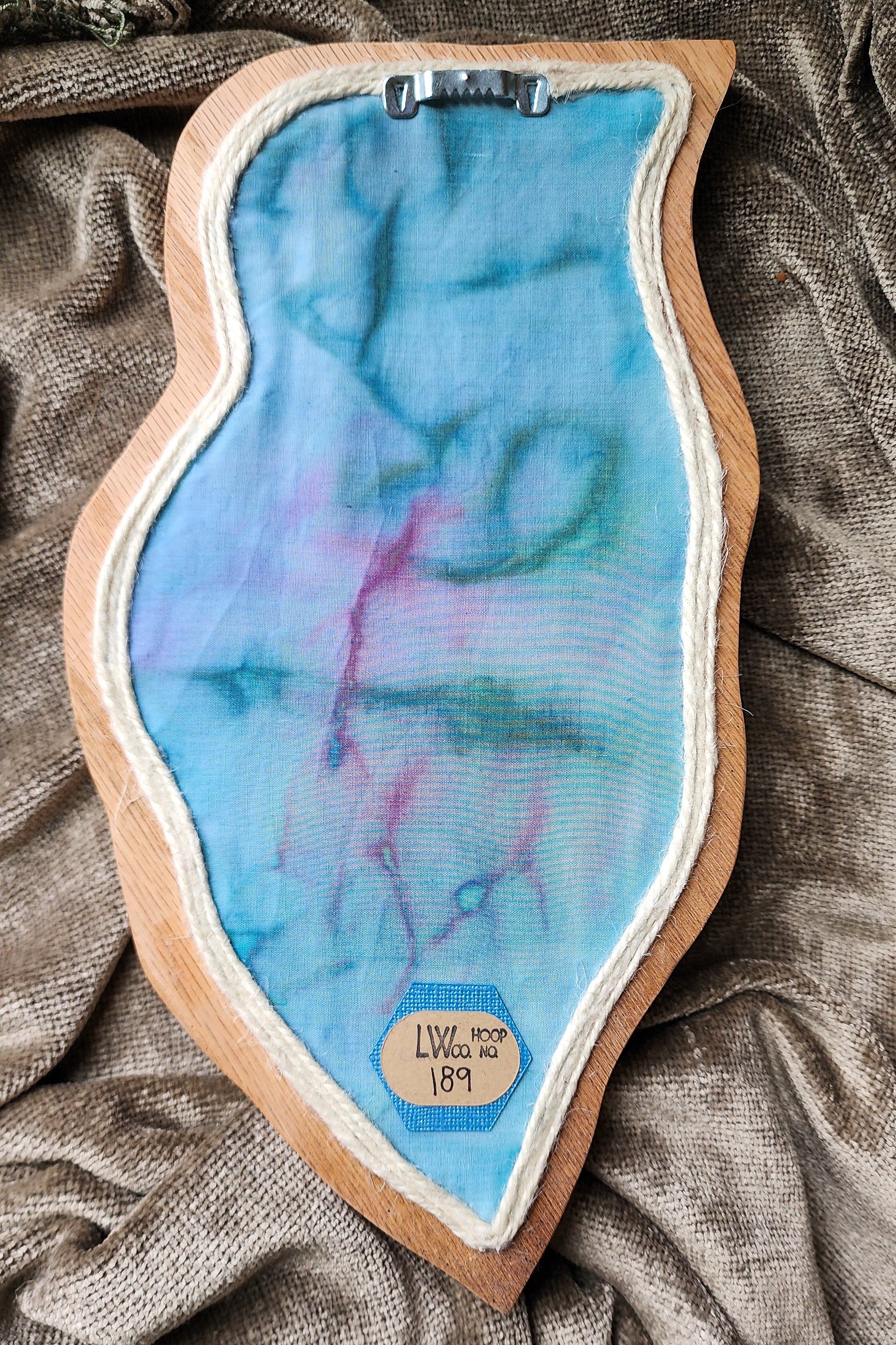 This 13 inch tall frame was made with solid oak and is one of a kind. Backed with dyed fabric, jute cord, and hoop number.