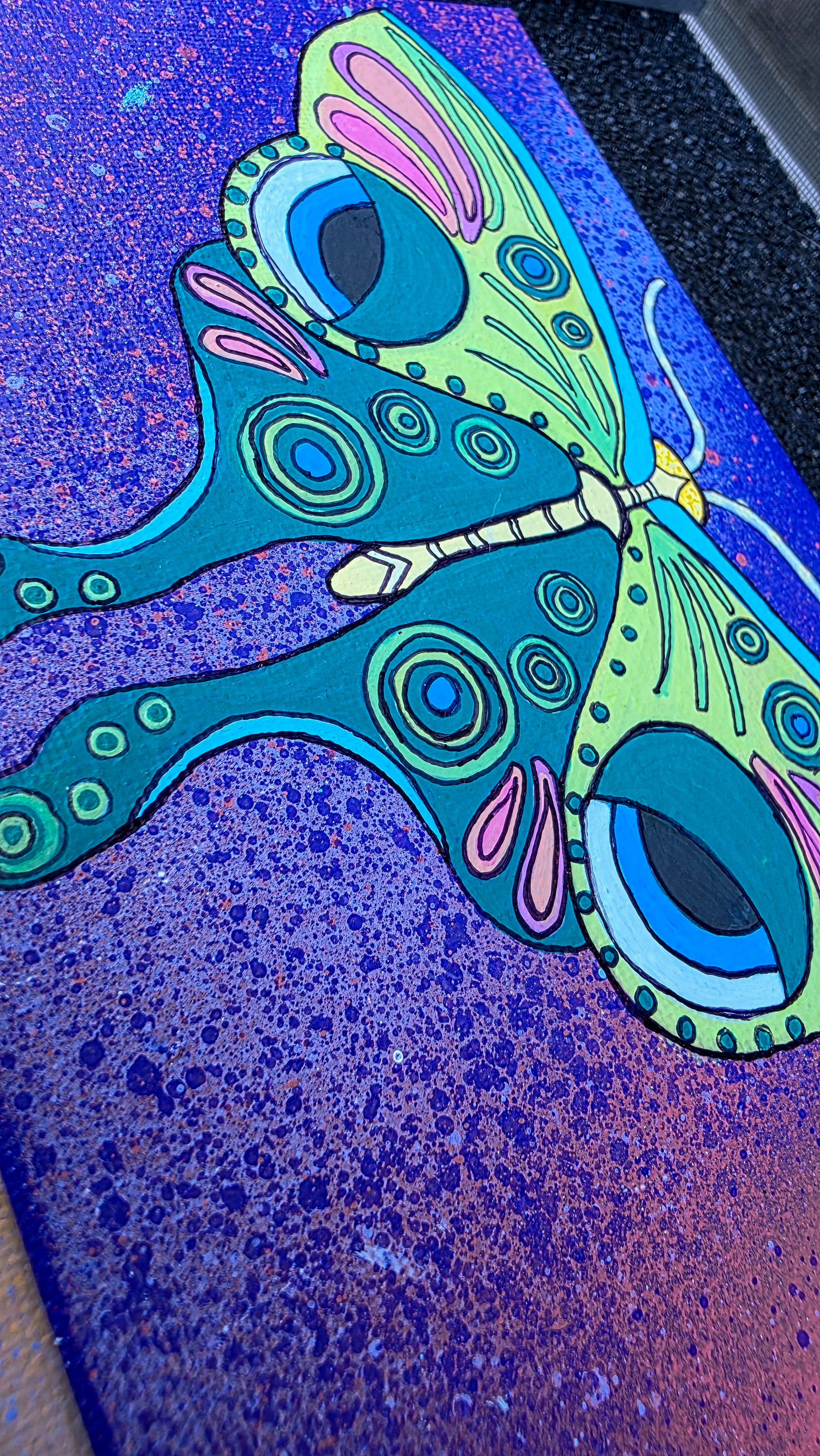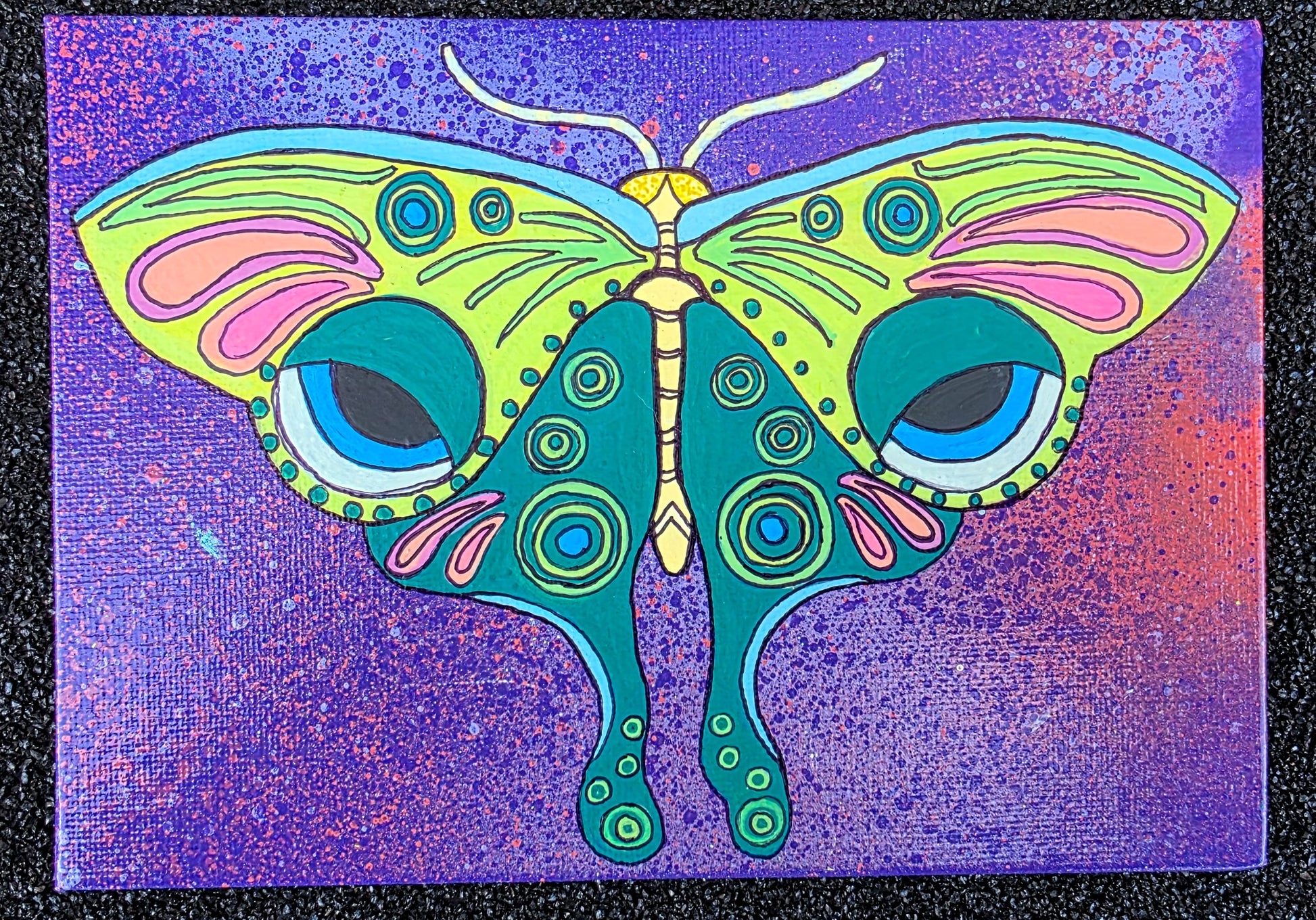 These are 5x7 chipboard canvas with original designs in acrylic paint pens on top of a spray painted background.
