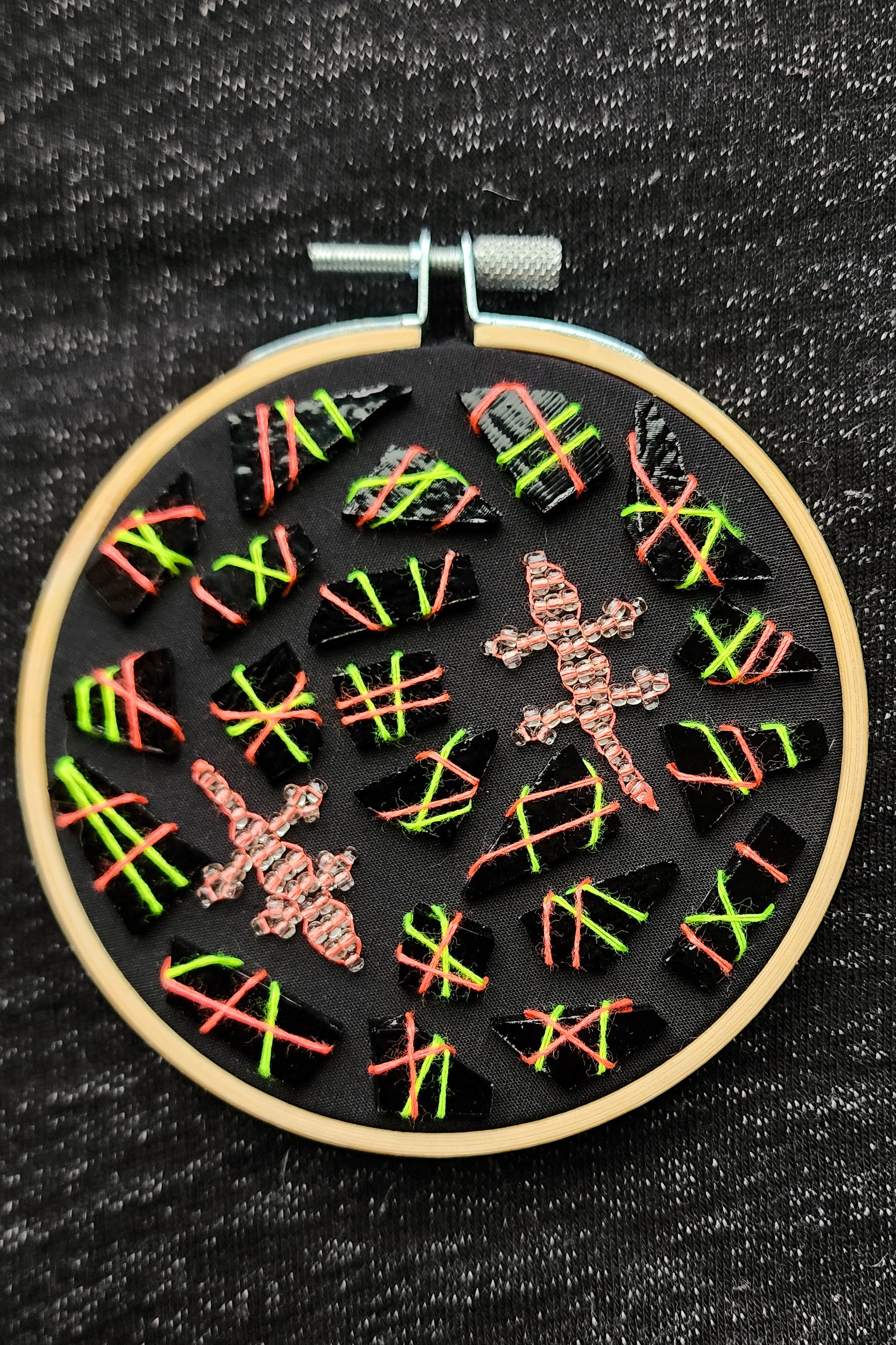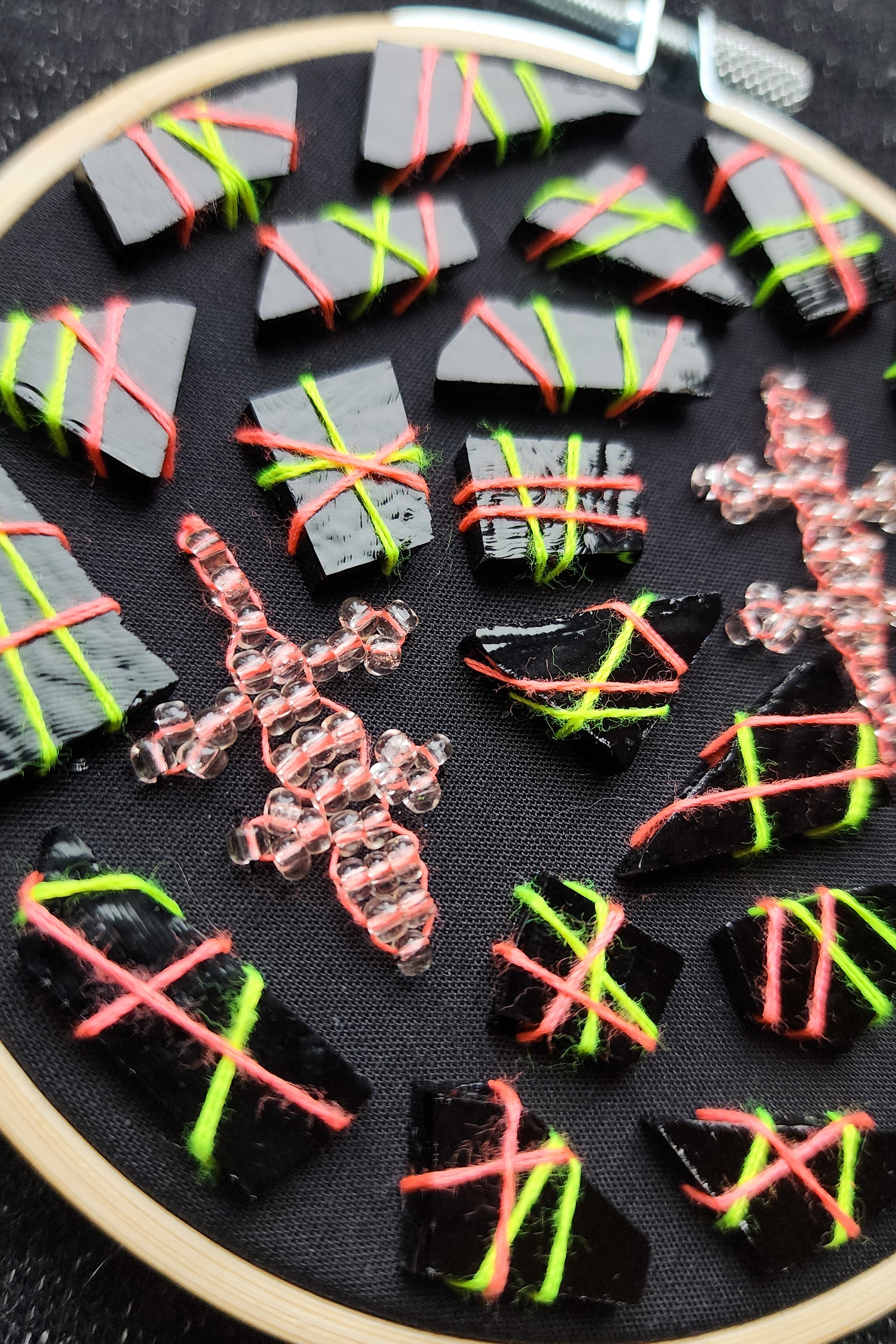 This is a four inch embroidery hoop with stretched black fabric, adorned with pink lizards, black glass scraps, and all stitched together with neon pink and green thread.