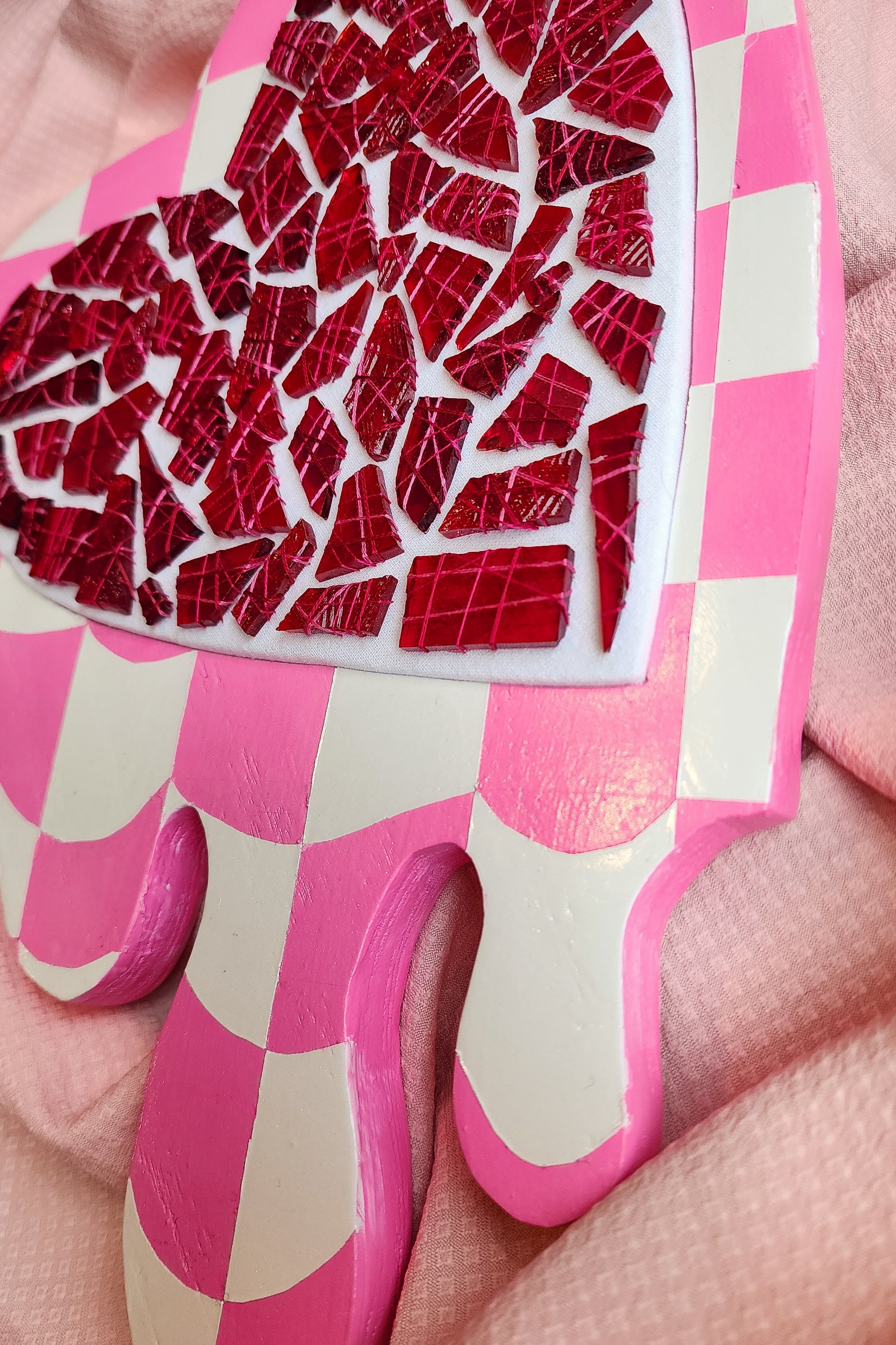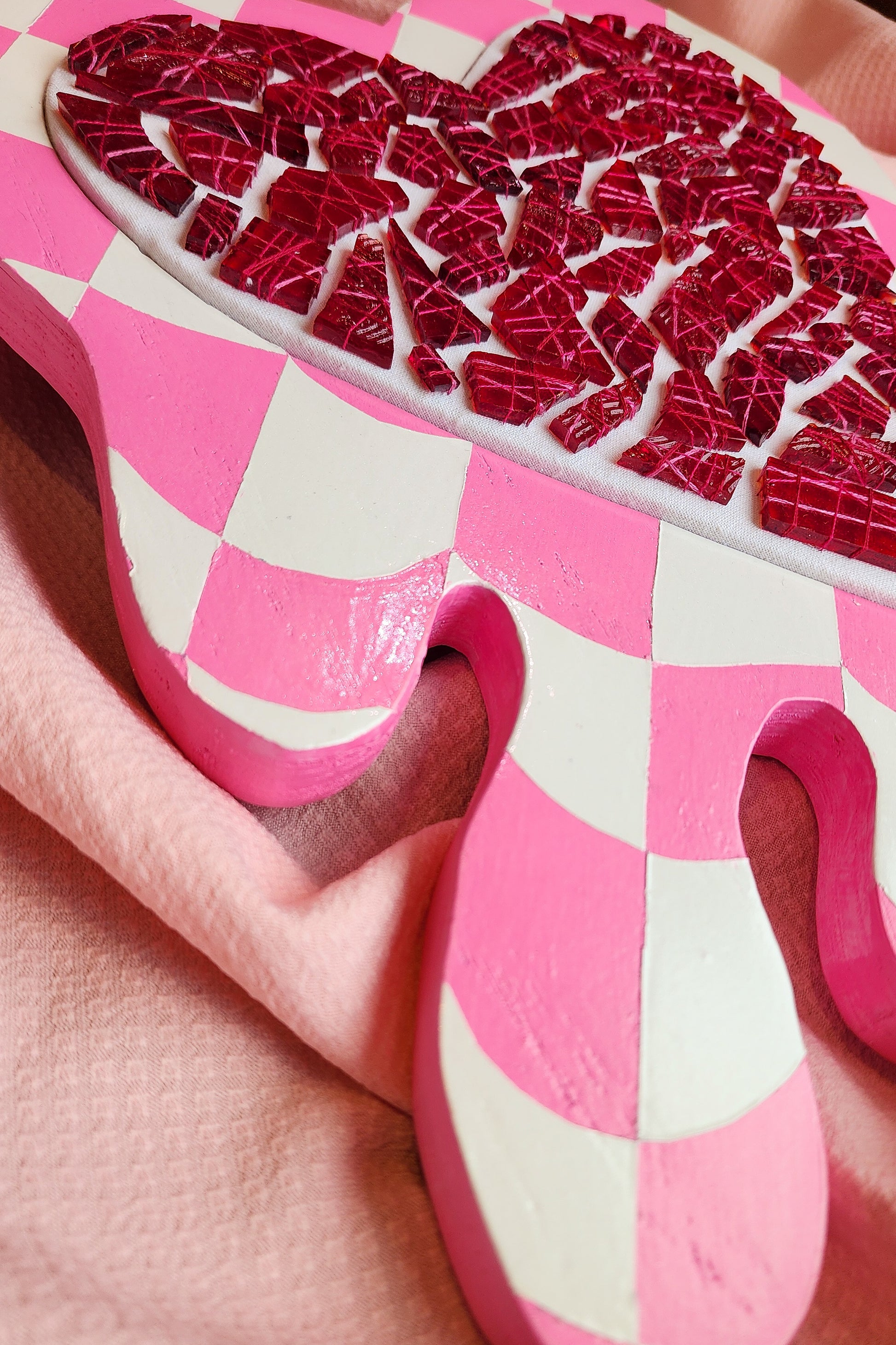 This dripping heart frame is made from one piece of oak wood with fabric stretched and secured in the heart shape center. It is painted with a pink and white dripping checkered pattern and sealed with a slight iridescent top coat and backed with a grey fabric, jute cord and hanger.