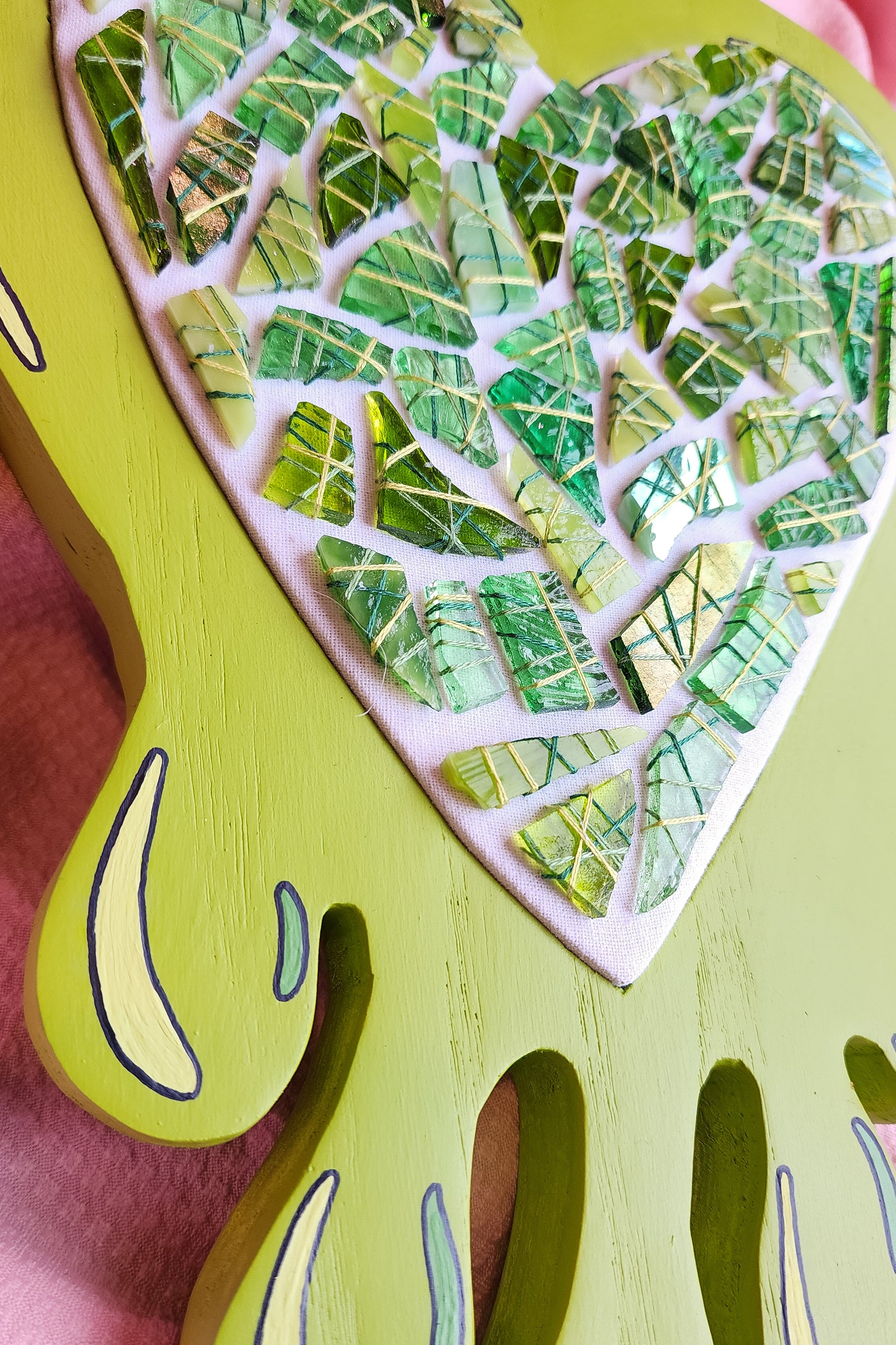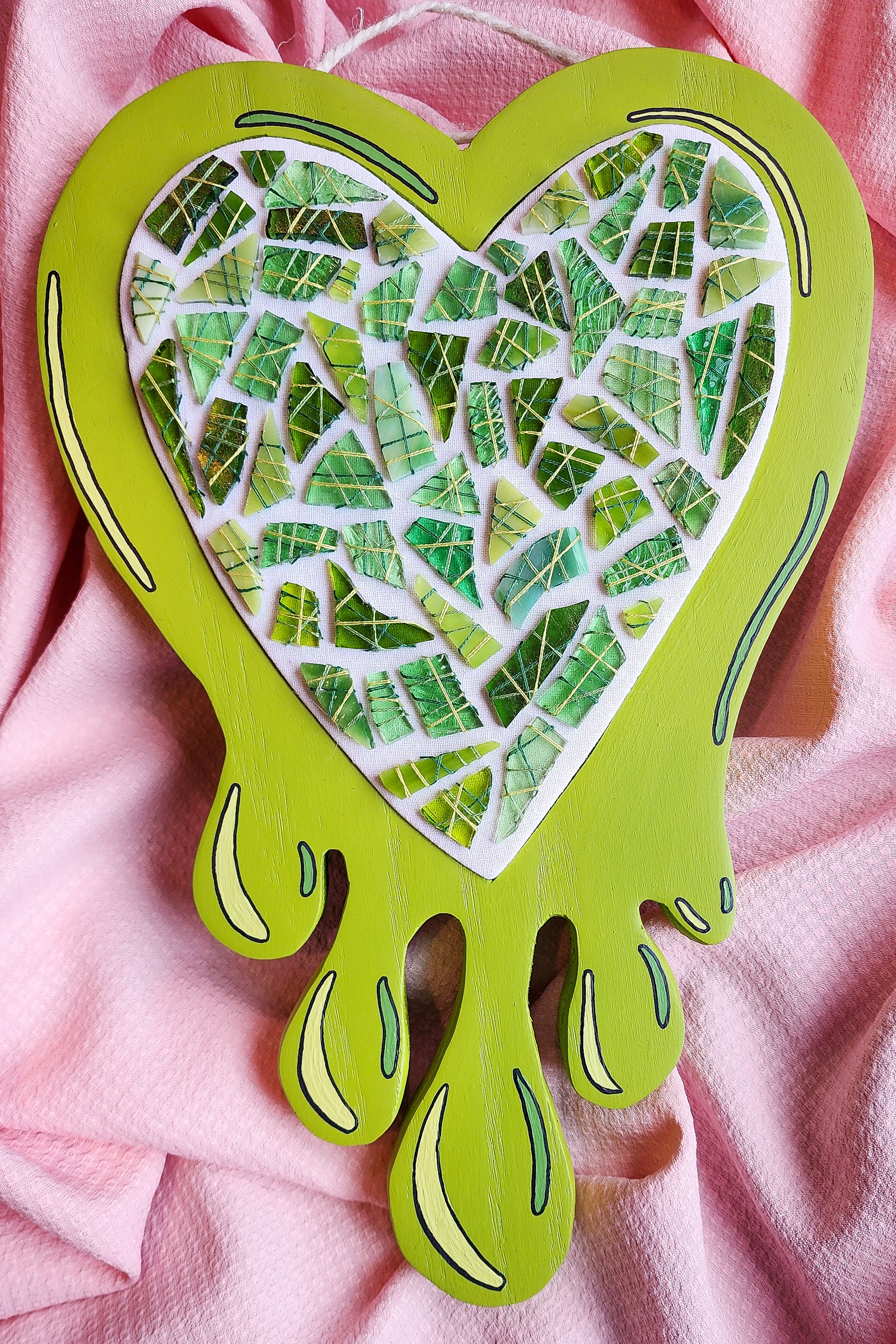 This handmade piece is cut from a single piece of oak wood and has a stretched/secured fabric heart center adorned with a variety of green glass mosaic. It is also hand painted in a slimy green comic style, is sealed with a matte top coat, and is finished with grey fabric and jute cord on the back.