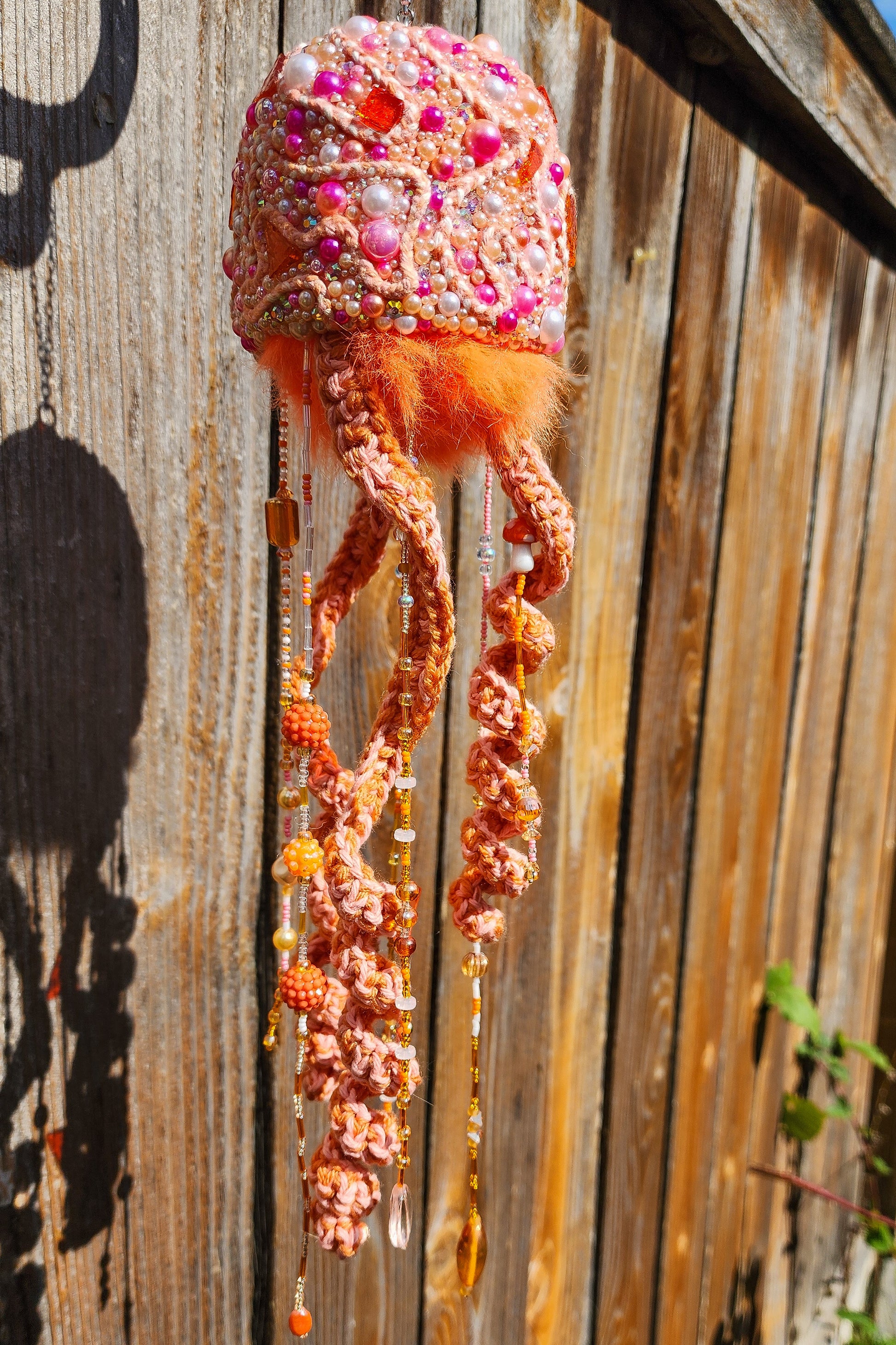 All of these items are handmade and are uniquely one of a kind. Each jelly has a mix of beaded tentacles, stained glass, charms, crochet work and other fiber arts.