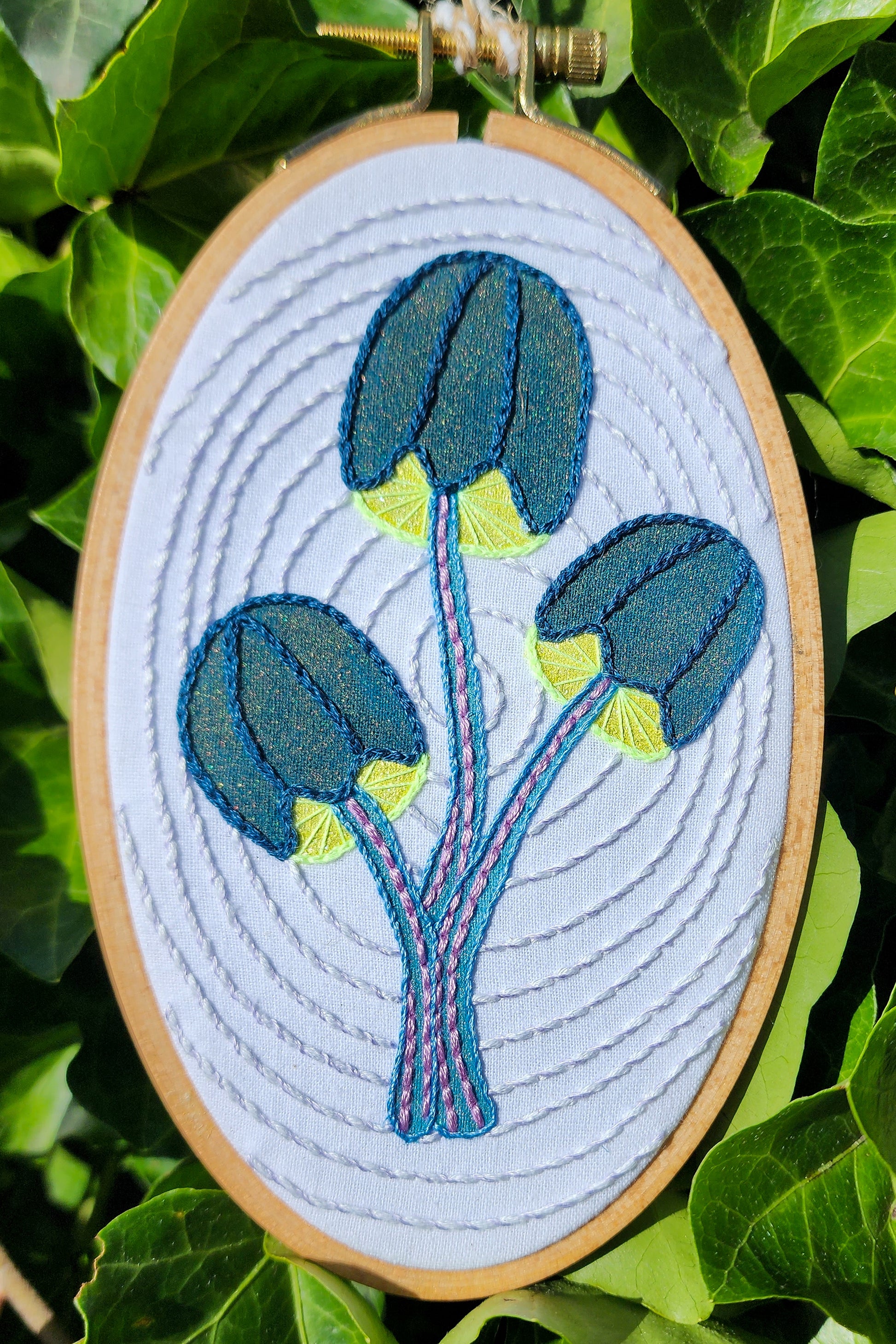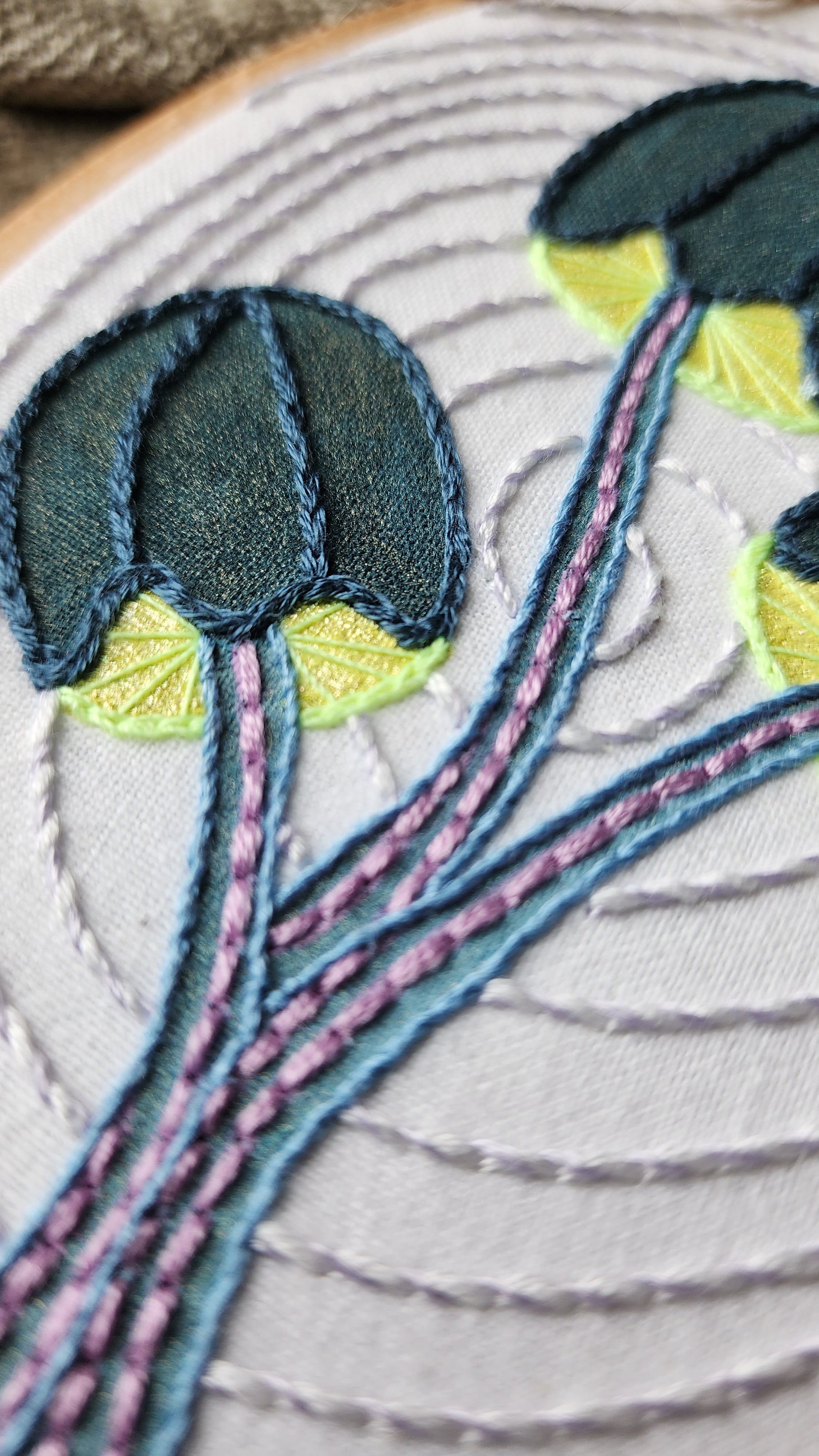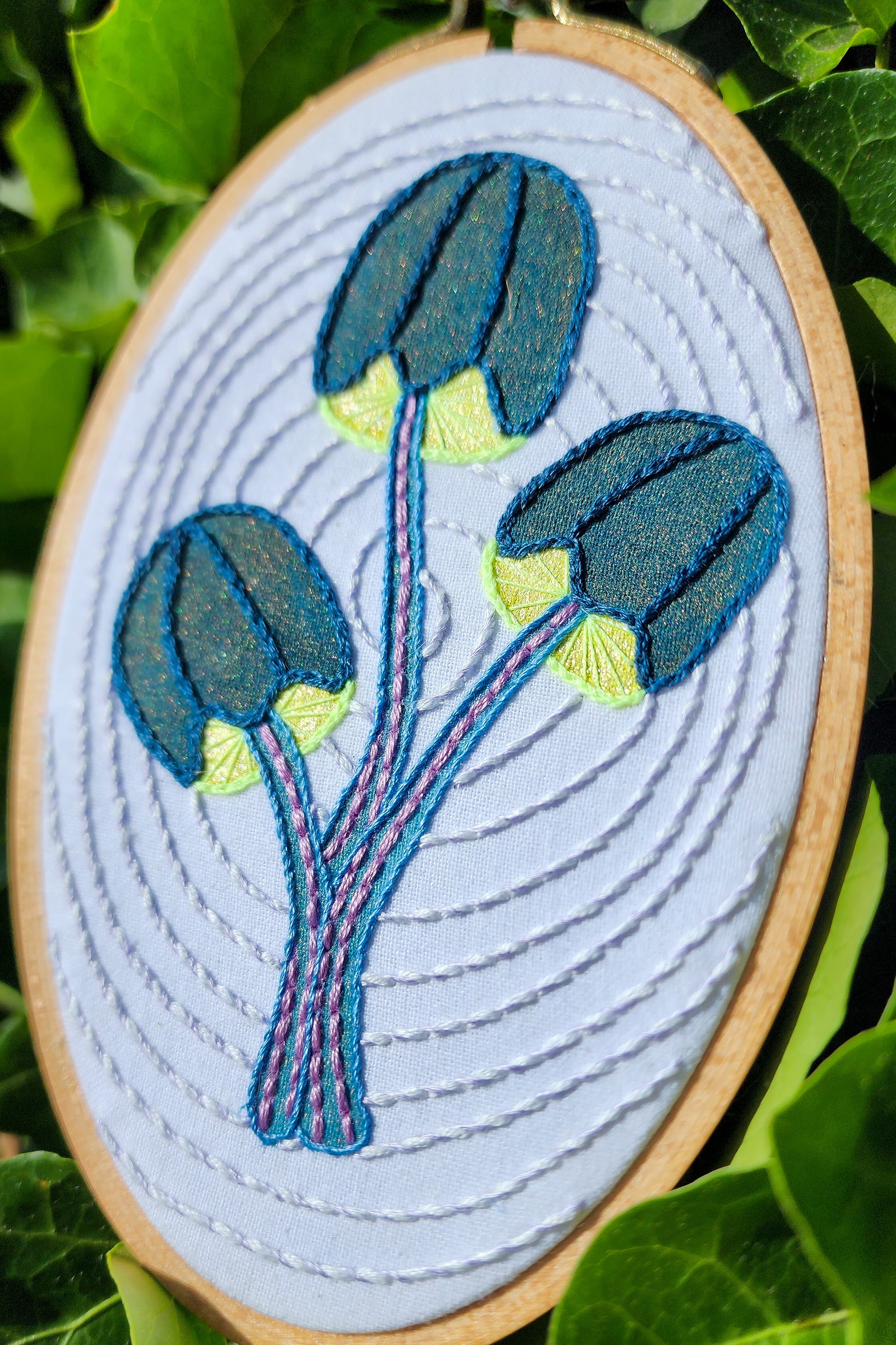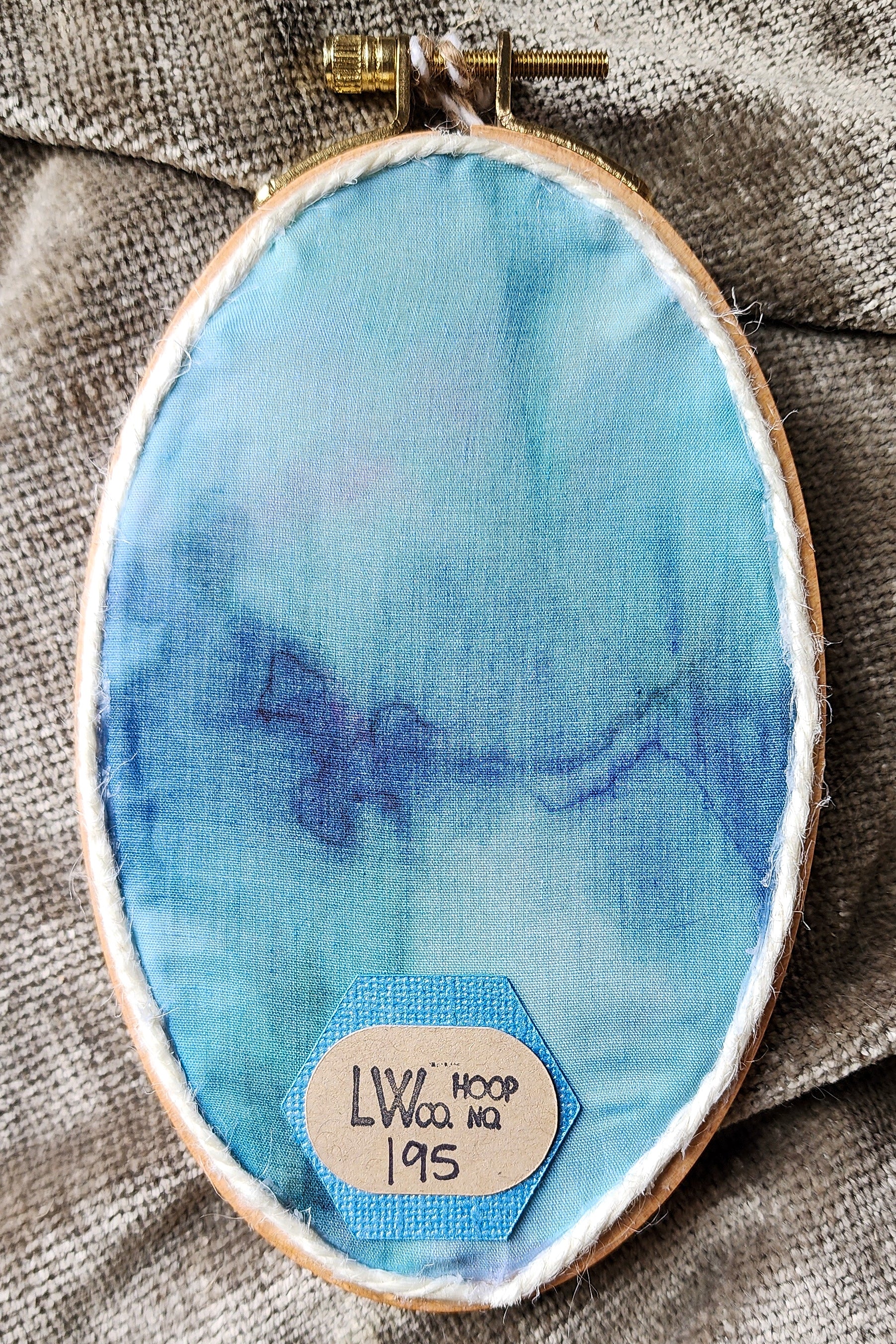 This piece includes more painted mushies with their embroidered details surrounded by an embroidered spiral background that is waiting to hypnotize you. Set on a stretched white cotton fabric inside a beechwood embroidery hoop. The piece is backed with ice dyed fabric and is finished on the back with jute cord and its hoop number.